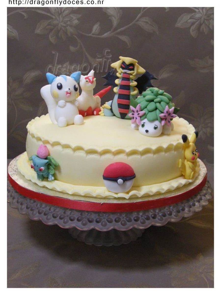 A Pokemon cake with gumpaste figurines of Pachirisu, Latius, Giratina and Shaymin.