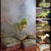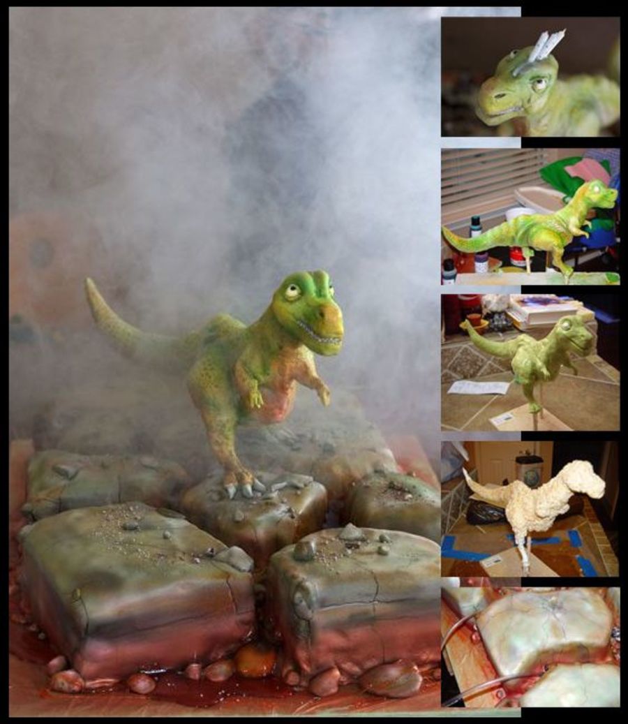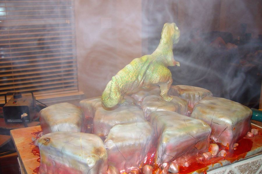 This is a T-rex cake I made for a friend. It's a Rice cereal Trex Figure covered in Fondant, painted, and torched to caramelize the colors and blend them. The cake is Chocolate/Butter cream covered in Fondant, painted, and torched. Then I added pluming for the Fog machine and made lava from poured Sugar. Here is the Tutorial of this cake. http://cakecentral.com/modules.php?name=Forums&file=viewtopic&t=685443&postdays=0&postorder=asc&&start=0