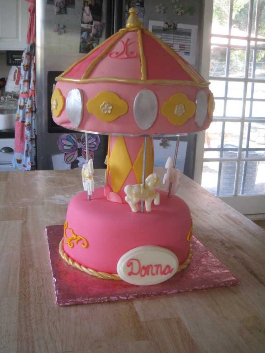 Both top and bottom are cake covered in fondant. Horses are chocolate molds. Top cake is on part of a cake stand and the dowel part is stuck into the bottom cake.