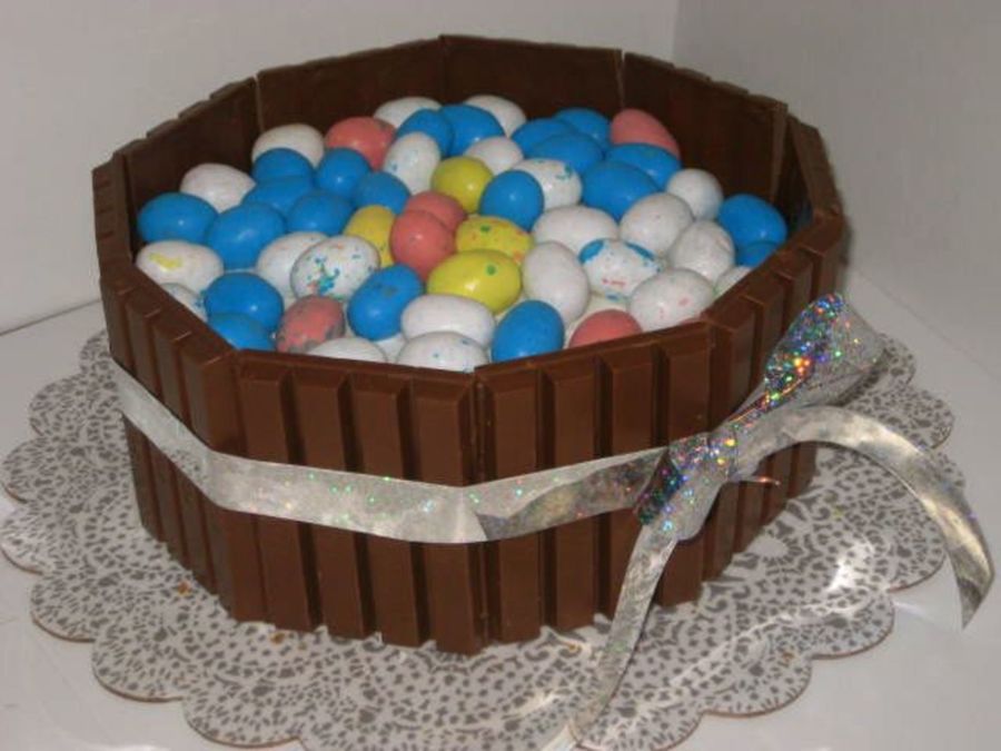 8"x3" round cake, torted and filled with strawberry fluff filling, covered with buttercream. Kit Kats around the outside and easter candy "Robin Eggs" on top. View my other cakes at http://slicethecake.blogspot.com - Thanks for looking!