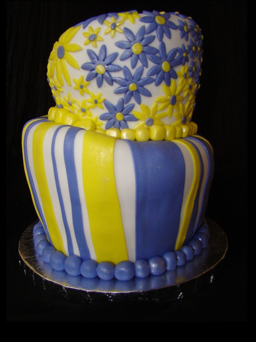 this was a b'day cake for a friends daughters 13th. It started as a 6' and an 8', about 6' high or a little more for each layer. Blueberry/lemon curd filling made by friends of their family (I got to keep the leftovers, which was very yummy!). The cake is actually purple and yellow but looks blue on my camera/computer screen, I have no idea how to fix that!