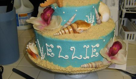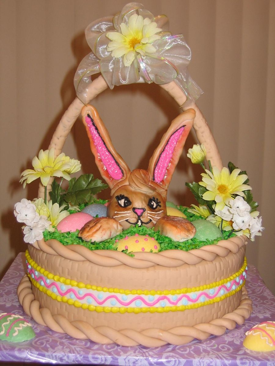 This is a 10" 2layer cake with rolled fondant and butter cream icing, the rabbit I molded out of rice crispie treats and covered with fondant, then airbrushed the details. The eggs are almond bark molded into the shape of eggs in various pastels. The handle is a piping tube with wire inside for stability covered with rolled fondant ..hope you like...=)