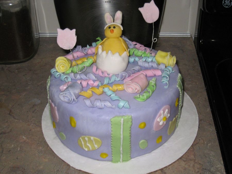 I made this cake for my work, as I work at an accounting firm and we had to be in the office on Easter. Bleh! It is also a banana cake with a cream cheese frosting. All accents are fondant including the chick on top!