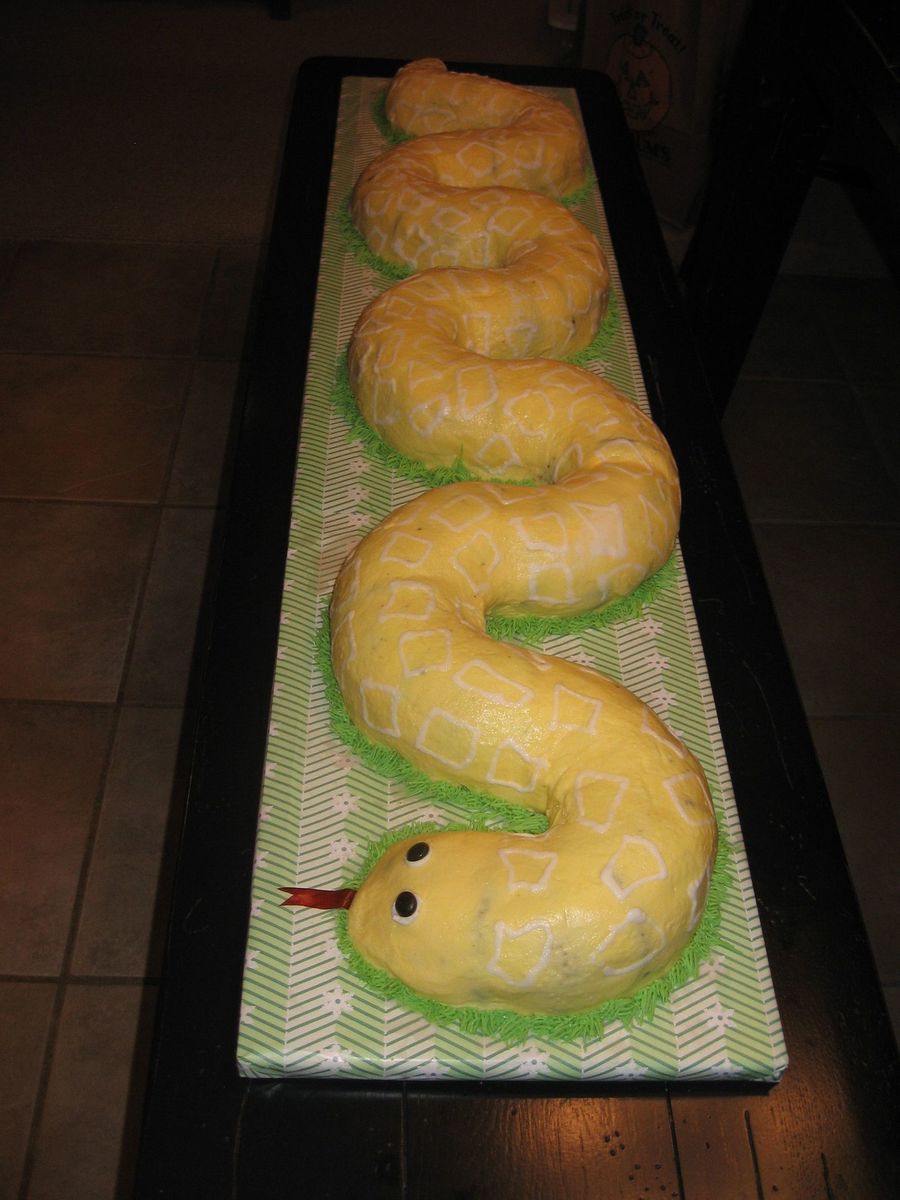 One really big cake! Was for a 4yr olds birthday who's really into snakes. Lots of learning experience came out of this. For starters the mother made the frosting and it was not something I'd use again. And we covered the board with wrapping paper and the frosting left grease spots. But overall was really happy with the end result. And the snake guy who came for the party was really impressed. BC with MM's for eyes and a fruit roll-up tounge.