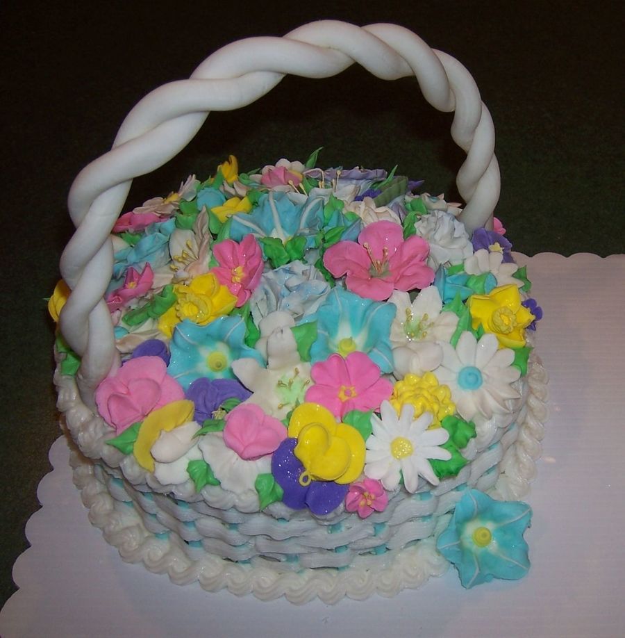 A basket cake I made for my family easter. Fondant handle and royal icing flowers.