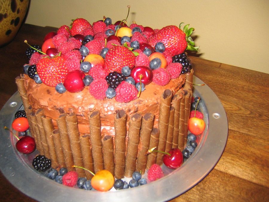 I made this as a going away cake for a colleague. It was devil's food cake topped with strawberries, blueberries, blackberries, cherries, and raspberries.