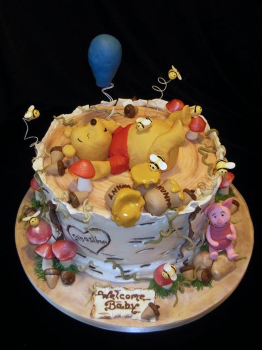 This was what I came up with for a pooh themed baby shower. 10 in cake covered in fondant. All fond. accents except for pooh and his balloon which I made out of rice krispy treats and covered in fondant. TFL