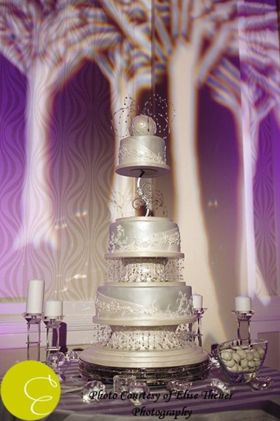 We were asked to create a cake for the "I Do" wedding event that took place a few weeks ago. It was a mock wedding were 100 brides to be came and attended the event and watched a fake couple get married and have a reception. We were the only cake vendor asked, so it was an honor! The spray and all the dangling jewelry were done out of swarovski crystals.