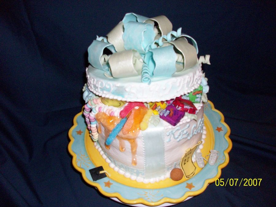 For my daughters birthday, I decided to try a gift box cake & include her favorite things while growing up. That is slim with gummy worms going down the side, Now-n-Laters, candy necklace, basketball jersey & shoes & graduation hat. I was fairly pleased but learned alot what "not to do" next time. Thanks for looking.