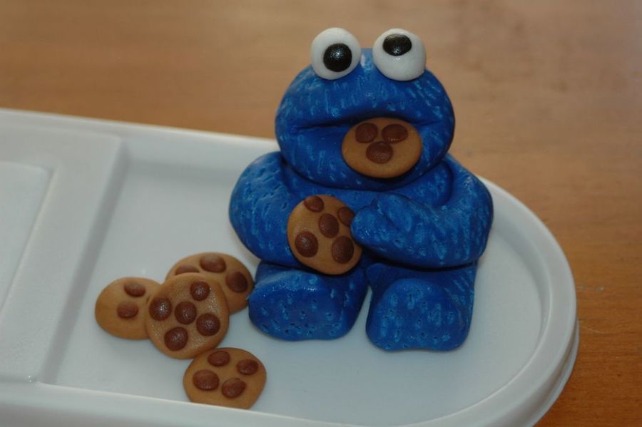 Fondant figure for my daughters 2nd bday coming up. His hand slipped and I didn't notice it so it has since been fixed so he is actually holding the cookie to his mouth :)