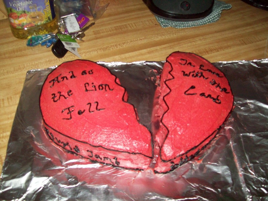 This is a Twilight cake I made for a friend for her bday. It is a hand carved heart, red velvet cake and butter cream icing. Also around the edges of the cake it has the quote" What a stupid Lamb What a masochistic Lion