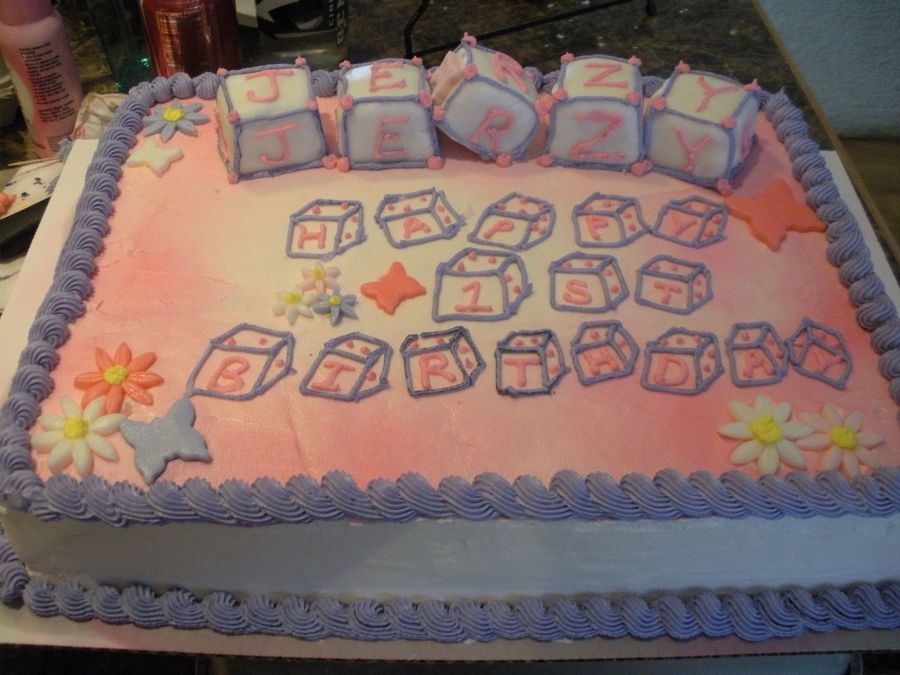 This was for my cousin's daughter's first birthday. They wanted something similar to the baby shower cake that I made for them with blocks. I got the inspiration from a couple of people here on CC. Sorry I can't remember their names.