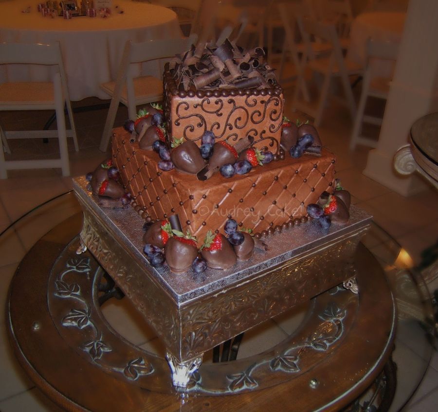 All bc, with Callebaut chocolate curls, chocolate covered strawberries and purple grapes. Sorry for the photography, the grapes to me look like blueberries! :) This cake is the companion to the pink and white wedding cake next to it in my pictures.