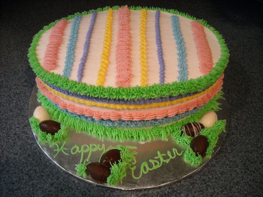 This is a quick cake I made for our Easter dinner. It is made from an oval pan. It is a WASC butter cake with all buttercream icing and chocolate eggs. TFL