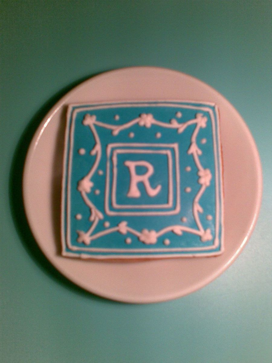 cinammon + nutmeg cookie with RI. this is the other eleni monogram cookie i made. this time with an R. the blue kind of started to absorb into the "R".