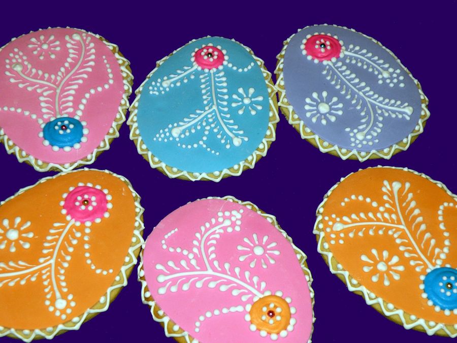 These were totally inspired by Kraach. Please look hers up, they are beautiful! These are sugar cookies with fondant over them, RI for decoration. Kraach's are middle eastern gingerbread and gorgeous!