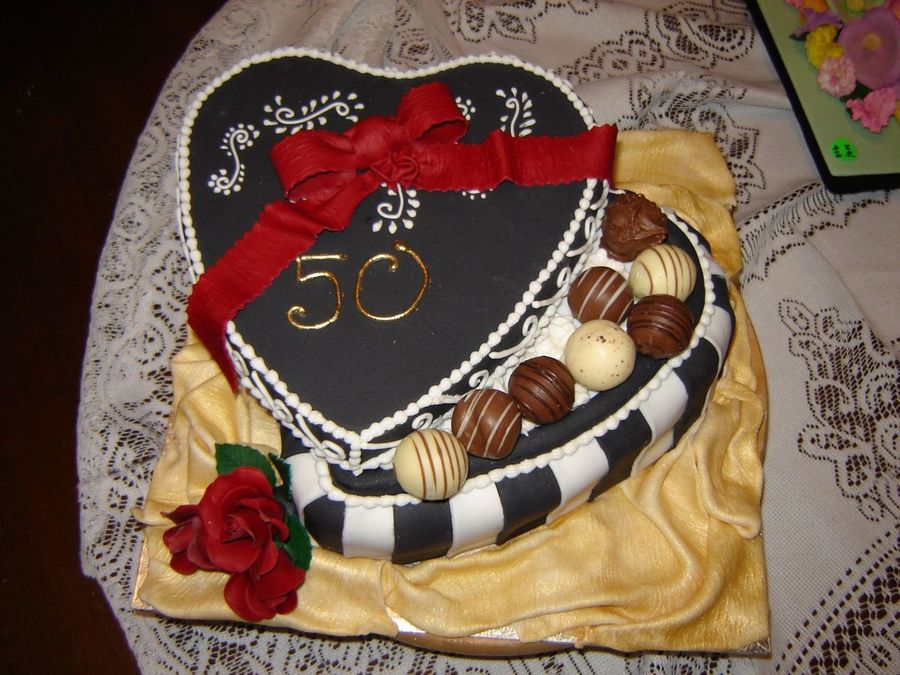 Rich moist chocolate cake baked in heart shape. Iced to look like a box of chocolates for a 50th wedding anniv. store bought truffles. material is gum paste dusted gold. Thank you for looking