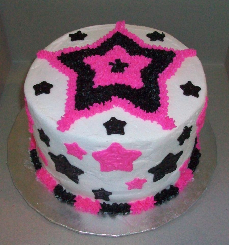 6" round - used fondant star cutters to make impressions on the cake as a guide. I cannot do a star shape at all freehanded.