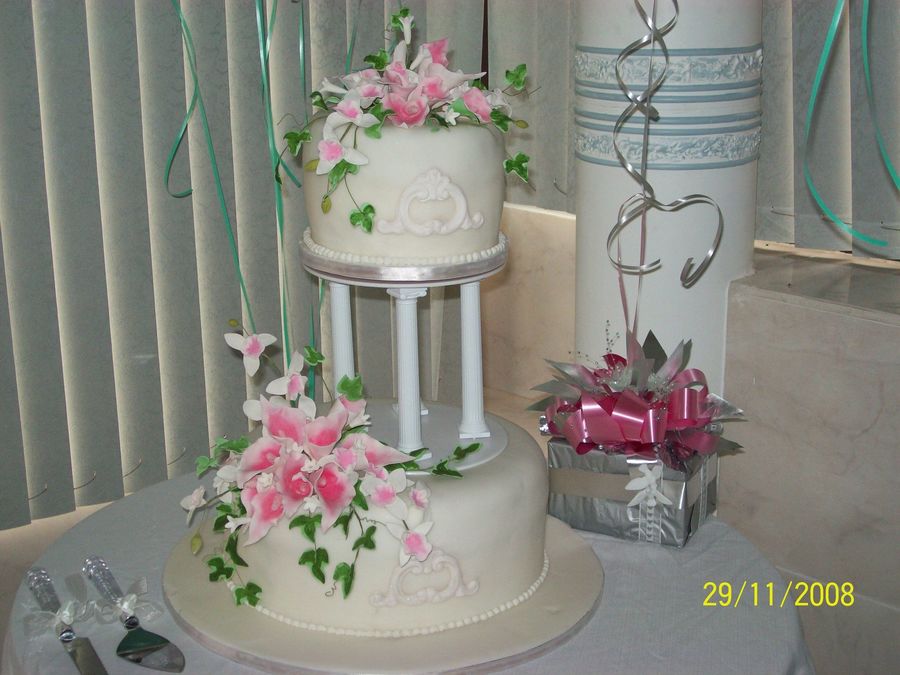 These were fruit cakes covered in fondant. The flowers are gumpaste. Thought I had too much pink when I did the callas but when I put everything together I found it looked great. Thank God the bride thought so too :)