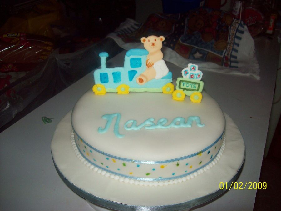 This is a christening cake I did. It's sponge cake is covered in fondant. The inspiration for this cake was from a cake book I have. I tried to do pressure piping but it came out like run out instead. I made sure I did three of those teddy bears and trains, because you never know when one will break.