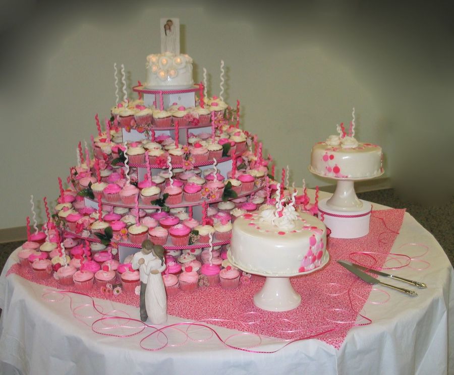 My largest wedding cake yet. 300 cupcakes and 100 servings of strawberry cheesecake. Each cupcake had either a fondant rosebud, fondant spiral or hand cut fondant polka dot confetti on it. The brides directives were "pink, non-traditional, and fun".
