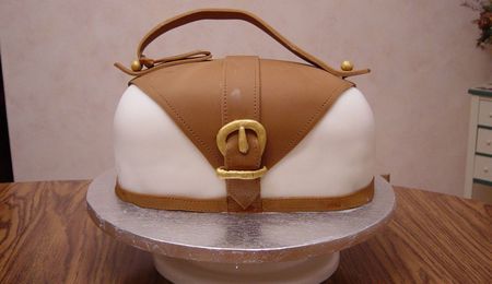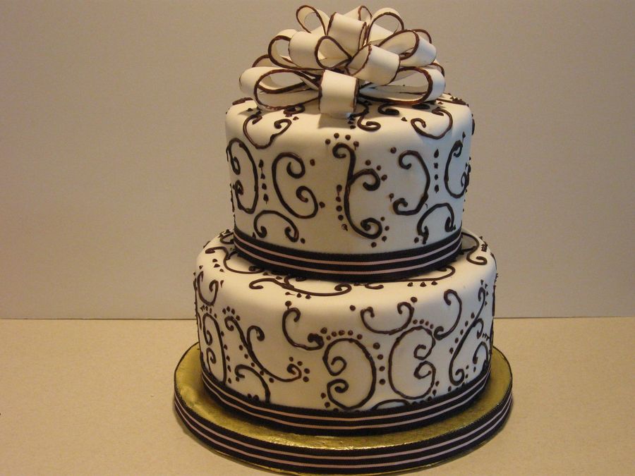 Fondant covered pound cake & strawberry creme filling for bottom layer, triple fudge with oreo filling for top. All fondant decorations, semi-sweet chocolate piping work and bow trim.