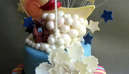 Covered with rolled fondant. Decorations are made of gum paste.