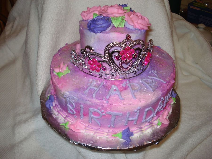 My first sold cake! 6 & 10, covered in BC, airbrushed with pink and purple, BC flowers. Next time I hope to make my own crown.