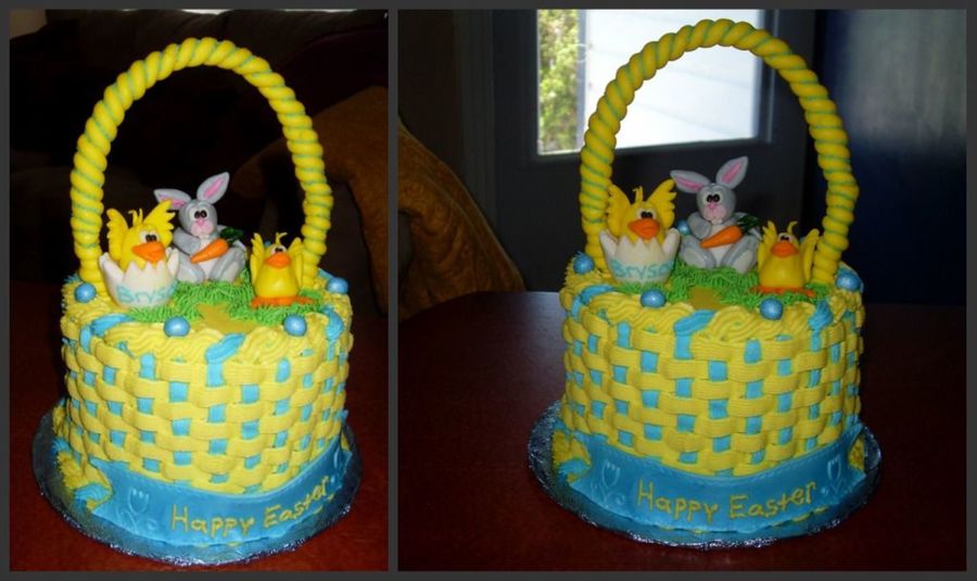 easter cake made for a friends little boy. white cake w/pineapple filling and buttercream icing. gumpaste chicks, rabbit and banner and handle is a floral wire wrapped in fondant. tfl