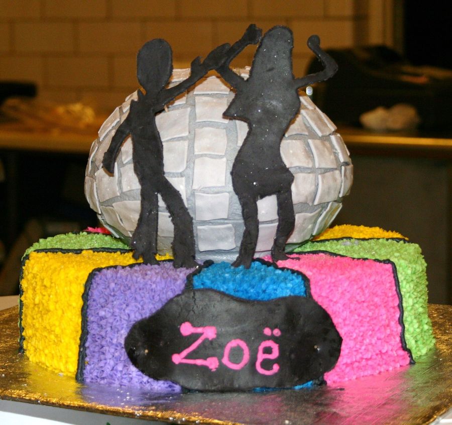 Cake was BC icing with Ball pan being used for disco ball with BC icing and fondant accents, figures were Fondant.