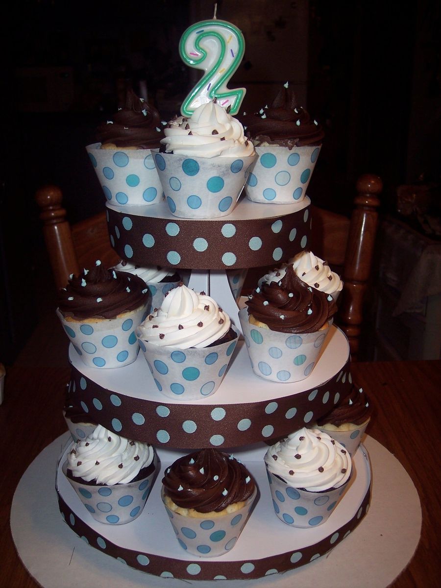 For A Boy. Handmade Cupcake Wrappers With Dots Printed On Sheer Paper. Paper cake stand with ribbon glued on the sides. Homemade fudge icing. Per-made white buttercream