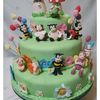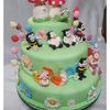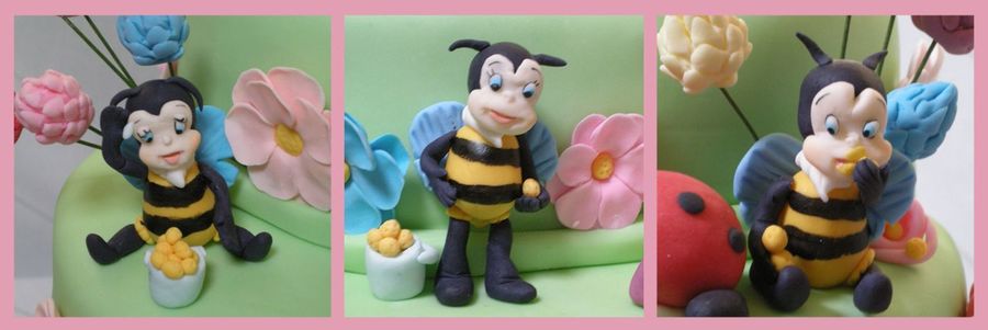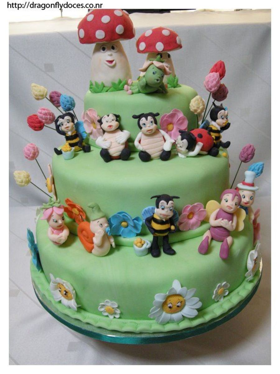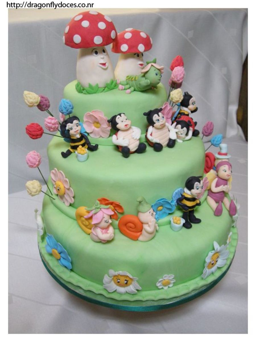 An enchanted garden cake with different kinds of garden creatures (ladybugs, bees, snails, catterpilar, butterflies) and also flowers and mushrooms. Everything made with gumpaste.