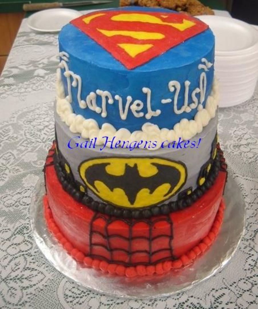 Pagents theme was superheros-titled Marvel-us as in to marvel- us/you/me theme, i've had alot of confusion with many thinking it was about Marvel super heros- sorry its not despite the use of one of marvel's super heros :) I simply found many designs like this on CC- i wish i could give credit to all those designs that inspired me but there were so many! The spiderman theme layer was triple chocolate fudge-needed more spider webbing lol-Batman's layer was spice cake,& Superman cake was Yellow. Each layer had Orange Essence flavor creamcheese frosting,& was iced w/basic buttercream. the Super hero symbols were self created stencils and stenciled on the cake then piped in and cornstarched/patted flat.