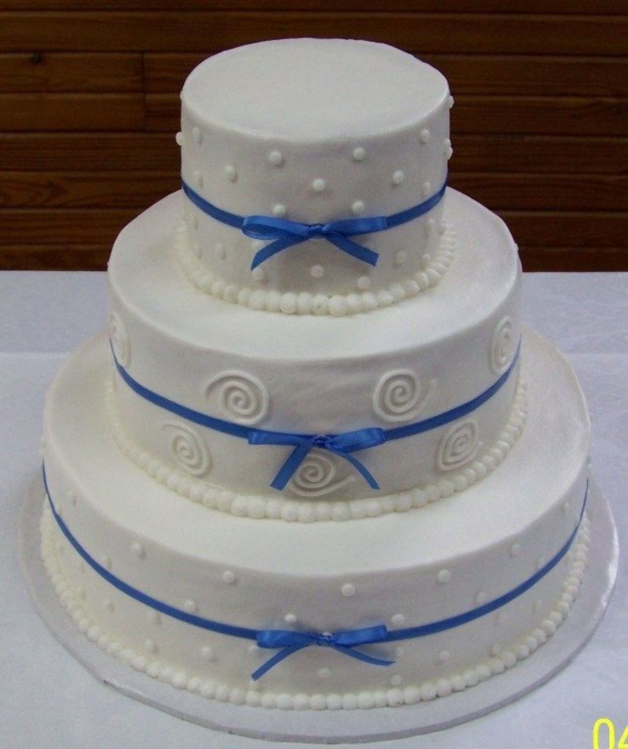 14,10,& 6 in round stacked cake. All buttercream with blue ribbons.