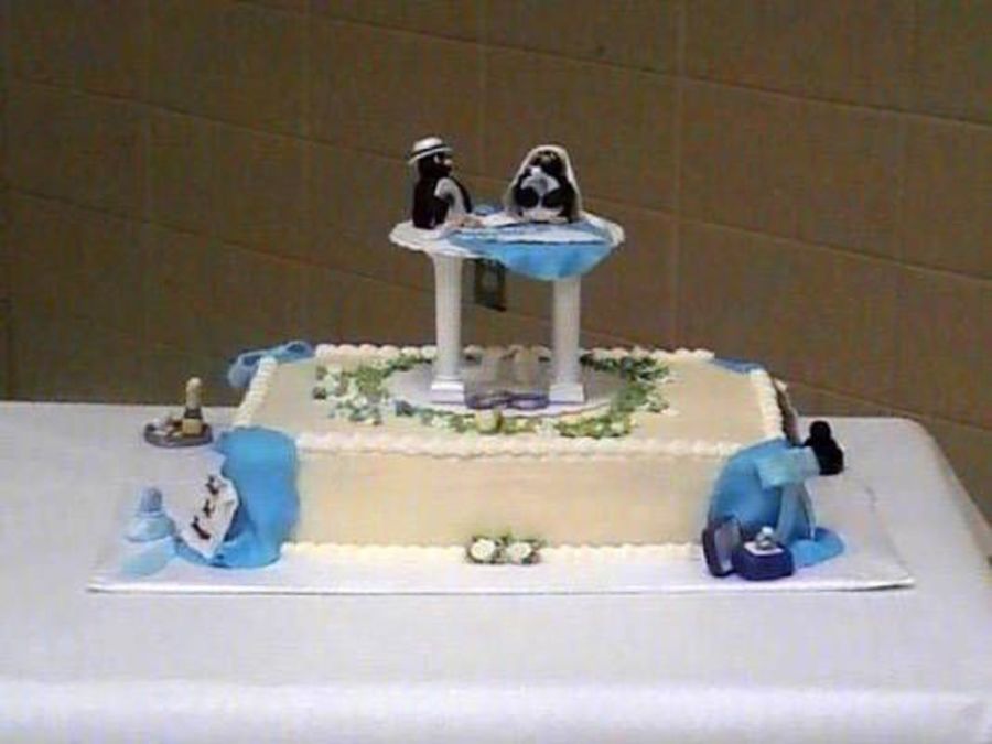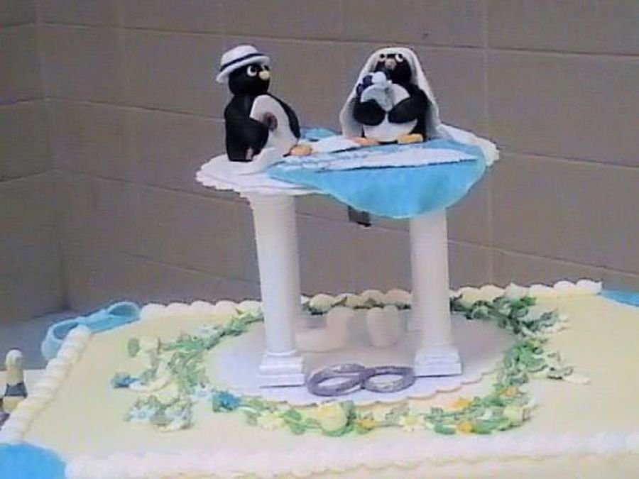 Son's wedding rehearsal. This is the largest cake I have ever done and ever made a cake for a crowd !! It's a champagne cake frosted with buttercreme. I put the flowers around the bottomplate, and then wanted to drape fondant on the ends. After I had finished it....of course, I found a how to article on the draping of fondant. I then put items I had made around it, 2 ink bottles, with feather quills, a ring box, and flowers. Put Penguins on top with feather quill and rose petals.