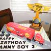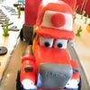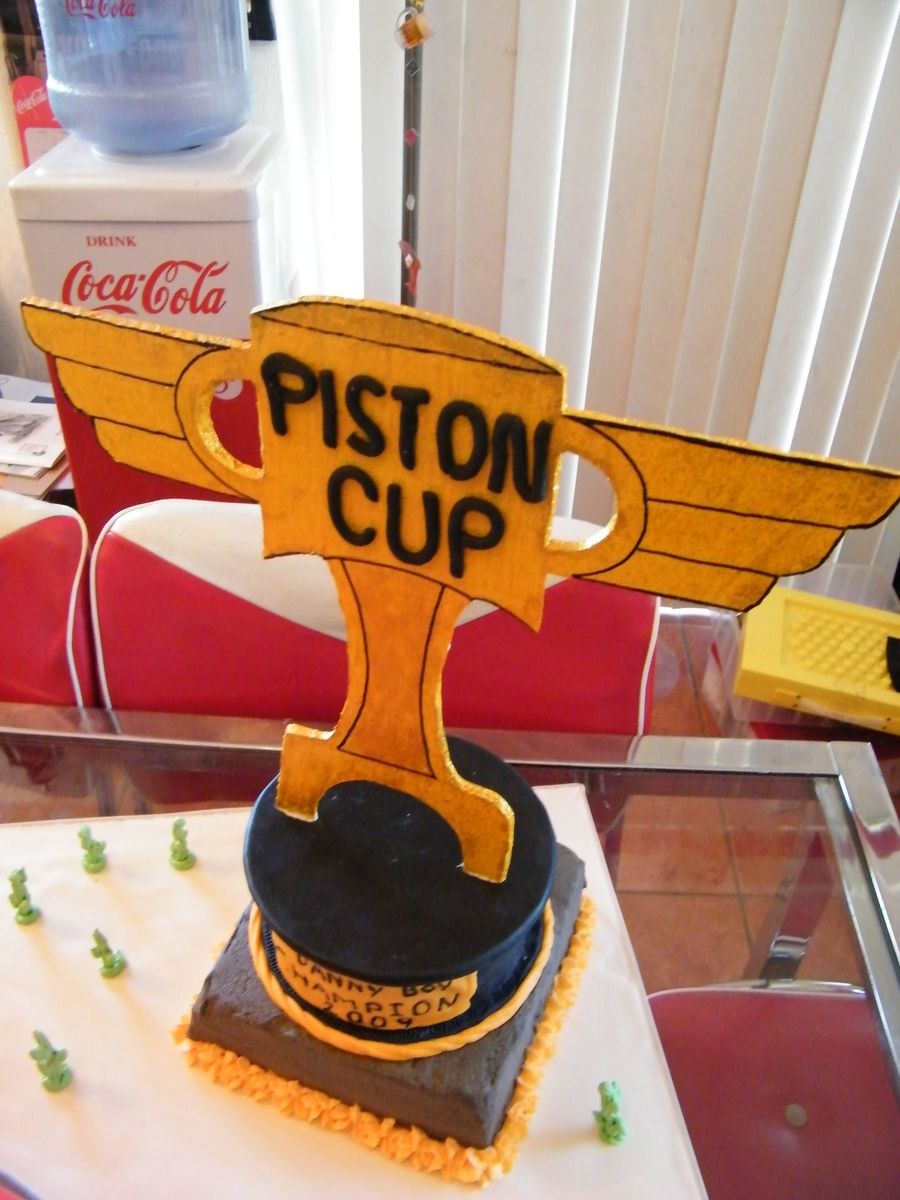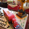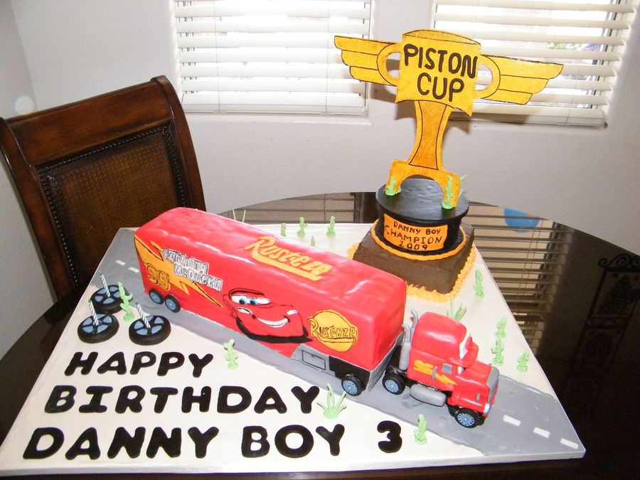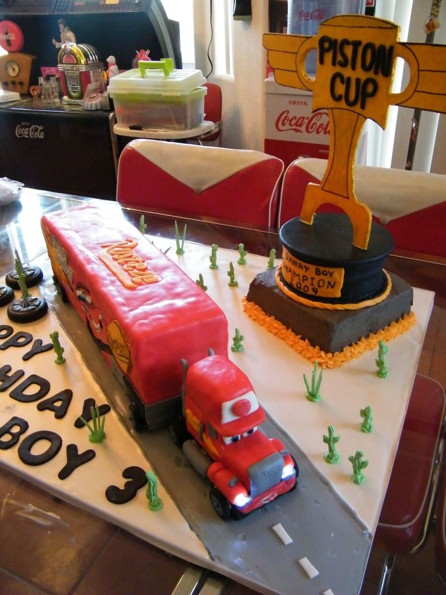 Mack truck is WASC with raspberry buttercream covered in MMF. Piston Cup Trophy cake 6" cake same as cake, bottom layer WASC with chocolate buttercream, trophy is foamcore board. Cake board covered with royal icing and RI cacti. Lot of work next time I will use edible images.