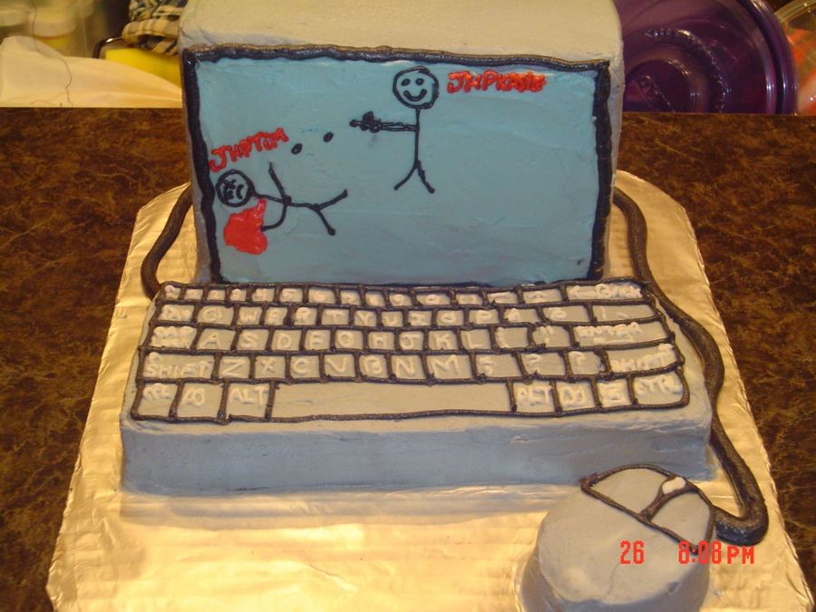 This cake is vanilla cake w/buttercream dream icing. I made this for my husband who is going to a computer get together w/some friends. Please excuse the bloody guy on the "monitor", but they like to play war games and he insisited! I would've done more detail on the screen, but it's a freebie!! anyway, hope you like it.