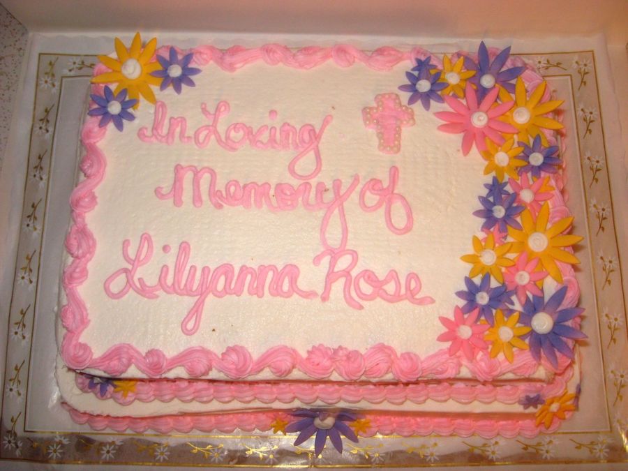 Cake done for a memorial/fundraiser for a baby who passed away. 1/2 w/ 1/4 sheet on top, marble cake, buttercream icing and fondant flowers.