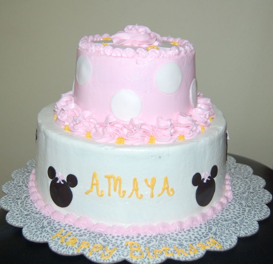 2 10 inch rounds and 2 6 inch rounds, fed 50. Thanks to all for the inspiration. Minnie heads are fondant, so are polka dots. BC icing all else.