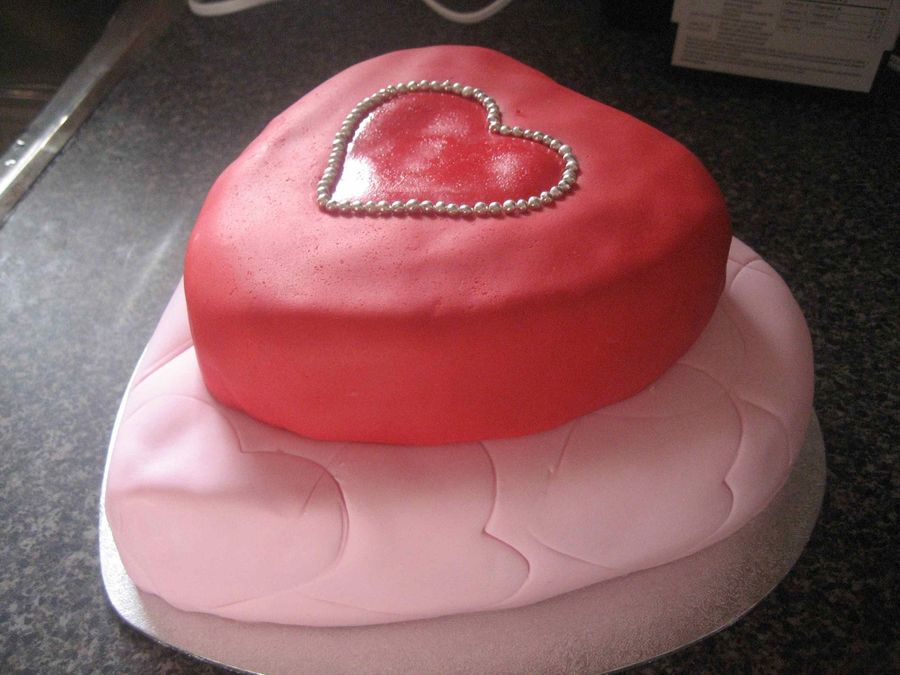 A co-worker wanted a cake for his family, no special occasion. Both layers are lemon cake but the bottom layer has a mixed berry fruit filling and the top layer has buttercream. Both are covered in buttercream and fondant. The heart on the top are silver balls.