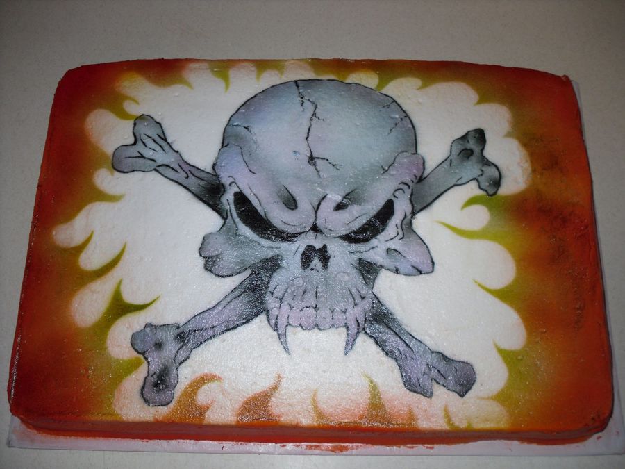 simple 13x19 cake with bc icing....Skull and flames were airbrushed. I used stencils that were made out of art paper, I first did a pencil drawing on the paper and made changes until i was happy with it and the cut it out with an x-acto knife. When i spray my colors i always go from darkest to lightest