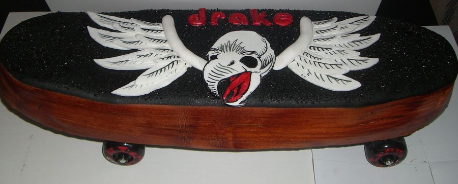 This was another cake on the actual board, only it wasn't as big as the first. I cut out the birdhouse logo and the little boys name freehand from fondant and then hand painted it. Thanks for looking.