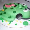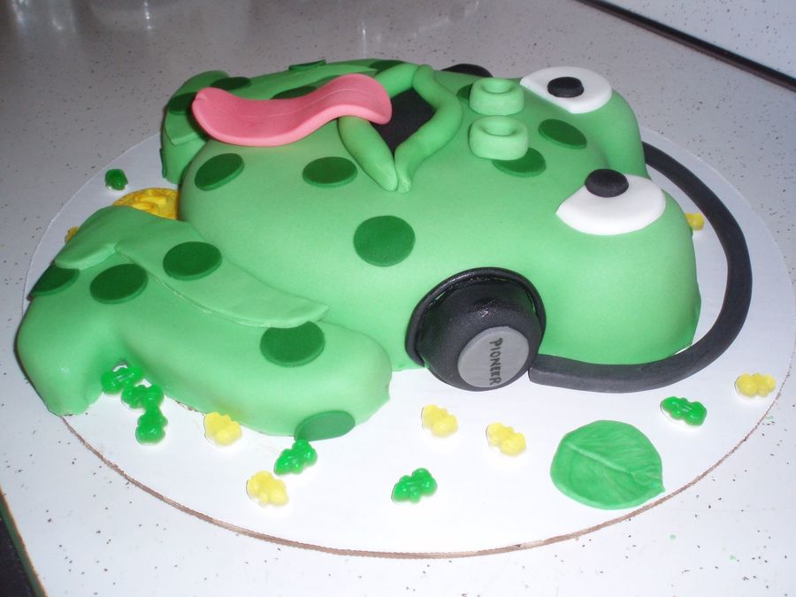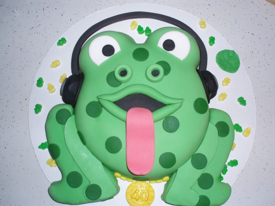 I've made this frog to a DJ's B-day. Chocolate cake with chocolate and fresh strawberry filling. Covered it with fondant. The headphones are little cakes also.