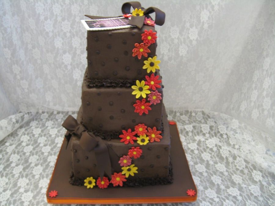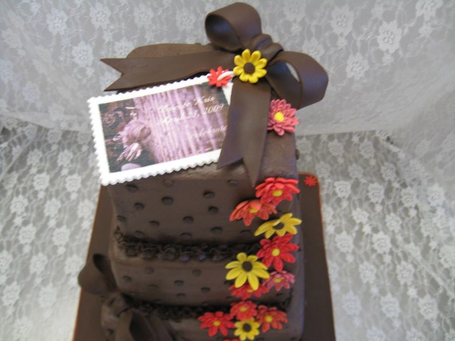 Chocolate wedding cake. Gift tag is GP replica of wedding invitation. Bows and flowers are fondant.