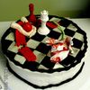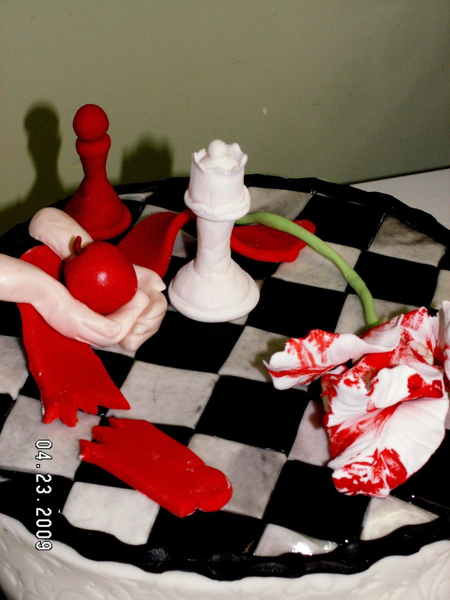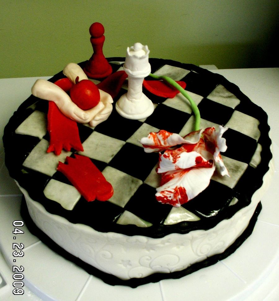 This was my daughter's request for her 14th Birthday party. I borrowed ideas from many of the cakers here. . .Thank you!!! This is an icecream cake made with Chocolate ice cream and butterscotch swirl ice cream separated by two chocolate cookie layers. The sides are MMF embossed with an ivy/flower pattern. The top is chocolate MMF (black color) and plain MMF. The little decorations are either a combination of MMF and Gum Paste or straight GP.
