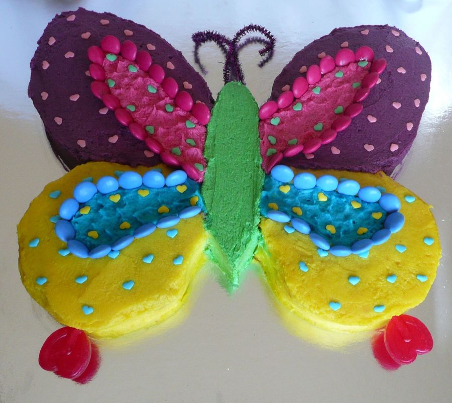 Similar design to a previous one I've done but much brighter colours. A butter cake sheet cutout using a template with butter cream icing. Lolly accents and pipe cleaner antennae.