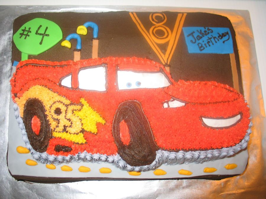 Lightening MCqueen on top of Chocolate Butter cream . With Fondant Pieces.
