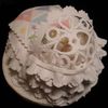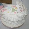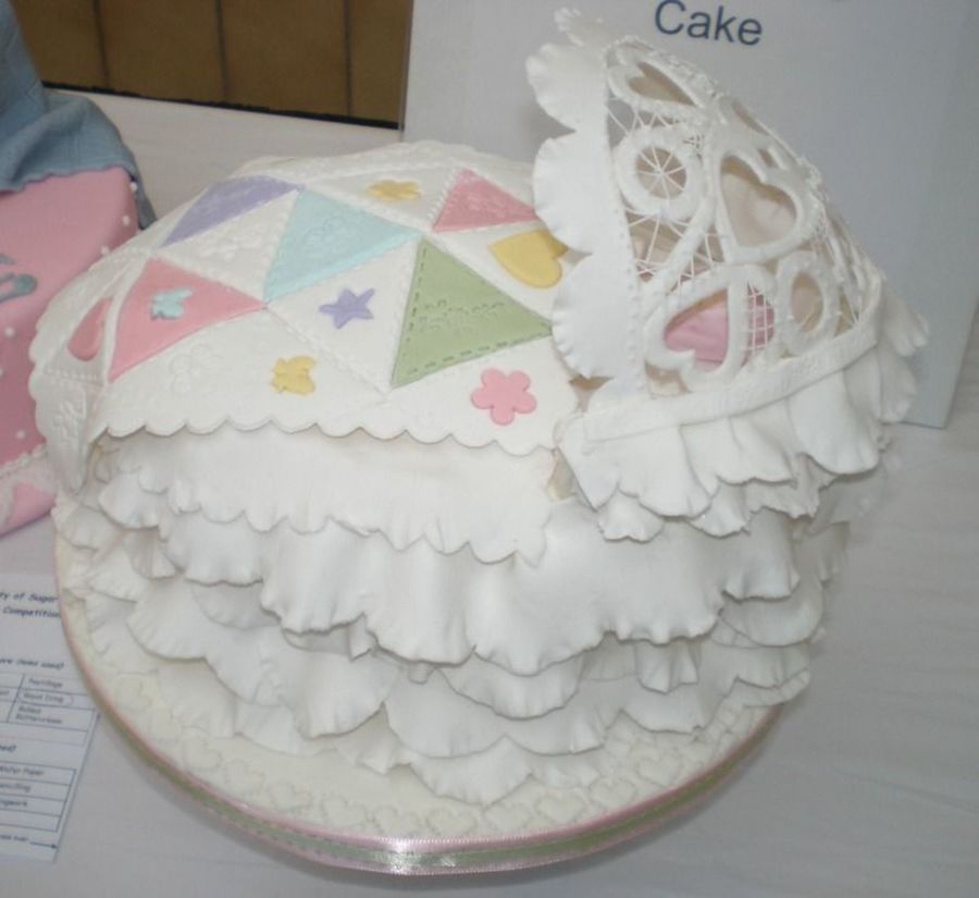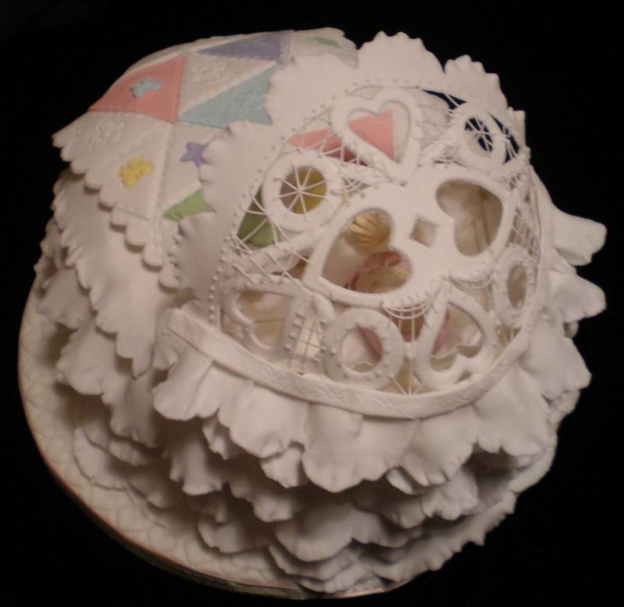 Baby cradle has a patchwork quilt and a battenburg lace hood.