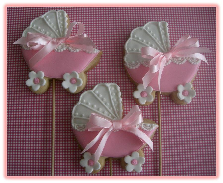 Butter cookies covered with royal icing, fondant accents and satin ribbon