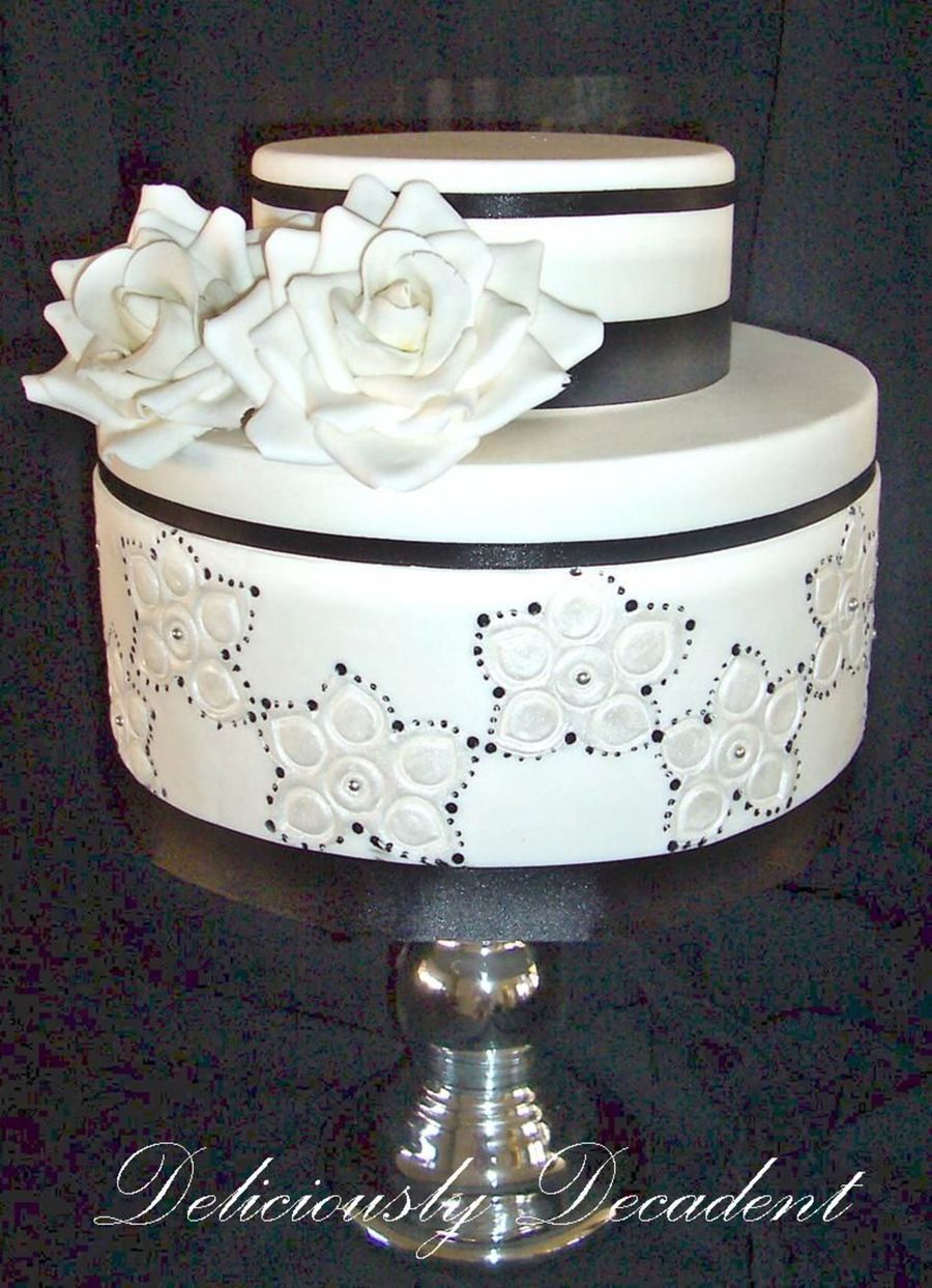 double barrel or extended base tier 10" 7" top. ribbon borders embossed with cutters painted with super white lustre and alcohol and doted with black food dye cachous in the flower centers,and gumpaste roses (my big daddy roses about 12cm or just ubder 5" wide). my version of a design i saw done by sweet art, thanks for looking!!
